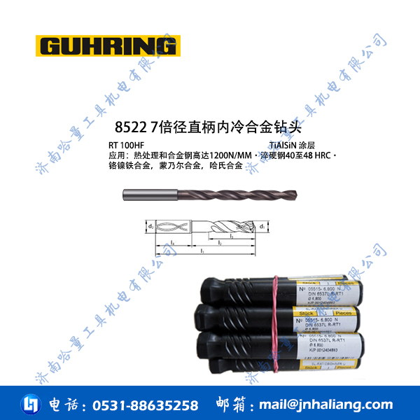 产品摘要:RT100HF高性能钻头 加工镍合金 8522 7倍径直柄内冷合金钻头