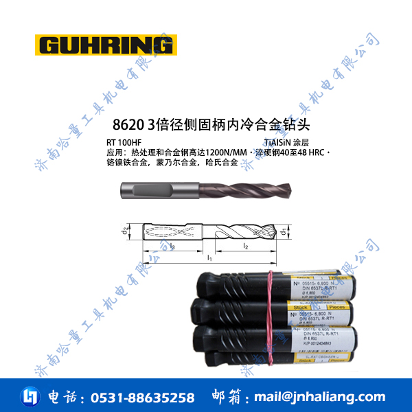产品摘要:RT100HF高性能钻头 加工镍合金 8520 3倍径直柄内冷合金钻头